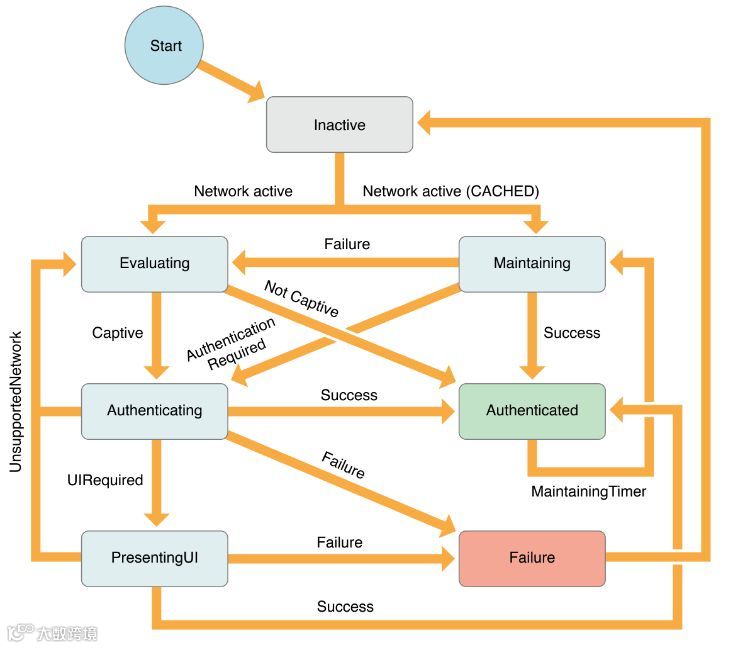 其实是因为IOS系统在分配到ip以后,如果该网络没有cache过,会进入网络评估状态,这个过程需要与注册为“热点助手(Hotspot helper)”的APP交互。系统先发一个评估(Evaluate)的命令给每一个热点助手,命令包含SSID和BSSID,每一个命令助手要在45s内做出对该网络的可信度(有none, low, high三档)评估。