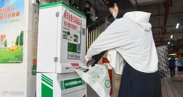 坡博农贸市场入口处扫码免费领取环保袋的自助机器,方便市民使用环保袋。