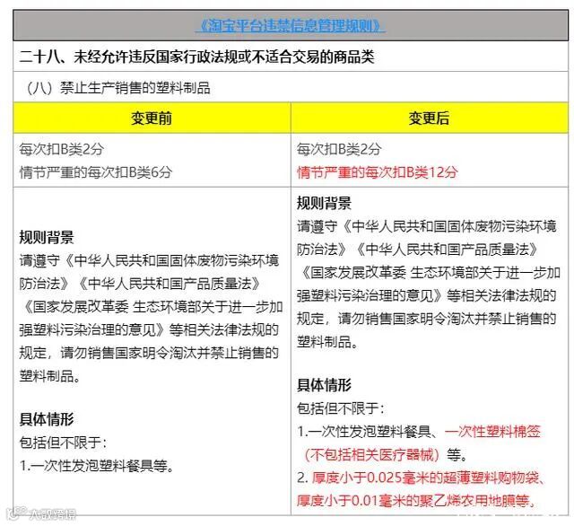 具体来看,《淘宝平台违禁信息管理规则》变更后,禁止生产销售的塑料制品每次扣B类2分,情节严重的每次扣B类12分。
