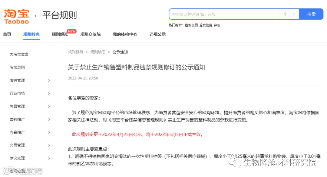 公告称,淘宝网将依据国家相关法律法规,对《淘宝平台违禁信息管理规则》禁止生产销售的塑料制品的条款进行变更。此次规则变更于2022年4月25日公示,2022年5月5日正式生效。