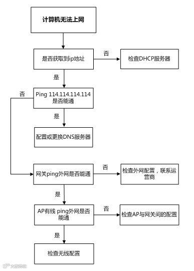 针对出现无法上网的问题,小编整理了一份简洁明了的流程图,可按照下面的流程图对网络进行简单排查。如按照流程图步骤执行仍无法解决,请联系相关人员。