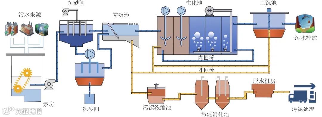 ♻️ 各环节产生的污泥通过浓缩(含水率99%→97%)、厌氧消化(停留时间20-30天,产沼气8-15m³/t)、脱水(含水率97%→80%以下)等处理工序,实现沼气发电与资源化利用。