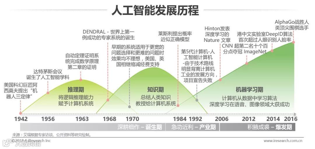 20世纪50年代到70年代初,人们认为如果能赋予机器逻辑推理能力,机器就能具有智能,人工智能研究处于“推理期”。当人们意识到人类之所以能够判断、决策,除了推理能力外,还需要知识,人工智能在20世纪70年代进入了“知识期”,大量专家系统在此时诞生。随着研究向前进展,专家发现人类知识无穷无尽,且有些知识本身难以总结后交给计算机,于是一些学者诞生了将知识学习能力赋予计算机本身的想法。发展到20世纪80年代,机器学习真正成为一个独立的学科领域、相关技术层出不穷,深度学习模型以及AlphaGo增强学习的雏形-感知器-均在这个阶段得以发明。随后由于早期的系统效果的不理想,美国、英国相继缩减经费支持,人工智能进入低谷。 80 年代初期,人工智能逐渐成为产业, 但又由于5代计算机的失败再一次进入低谷。2010年后,相继在语音识别、计算机视觉领域取得重大进展,围绕语音、图像等人工智能技术的创业大量涌现,从量变实现质变。