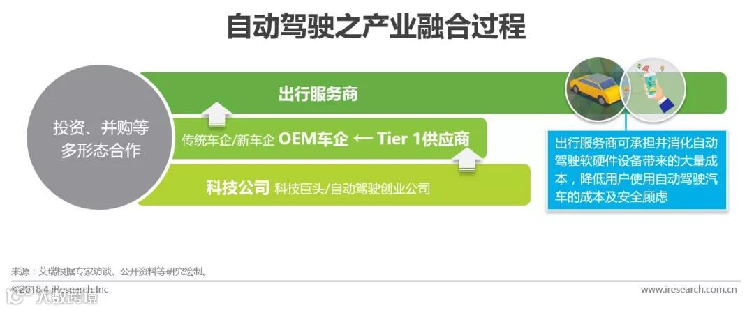 实现自动驾驶需要在汽车中装配大量的软硬件设备,而大量设备将带来高额推进成本。为减轻自动驾驶在推进消费市场时的成本等阻碍,可通过出行服务商进行系统安全性的评测并承担相关成本。智能化与共享化是汽车产业生态的重要发展趋势,车企、科技公司、出行服务商间的合作结盟也会愈发频繁,智能出行公司随之诞生。