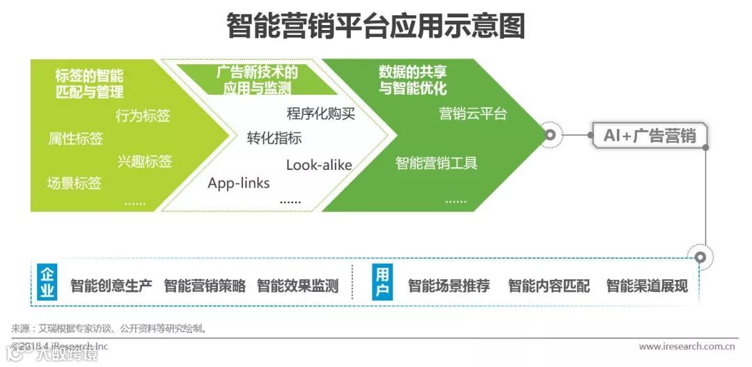 相比人工智能在传统行业的摸索尝试,人工智能与广告营销的结合已有成熟落地(得益于数字营销领域较好的信息化、网络化基础以及互联网公司卓绝的技术创新力),用户在搜索引擎、信息流产品、视频网站、电视中看到的相关广告可能都经过了人工智能算法对多维度大数据的智能分析。人工智能力图为企业提供智能创意及营销策略和效果监测,结合场景、内容及渠道向用户精准推荐,实现满足用户真实需求的高价值信息传递。