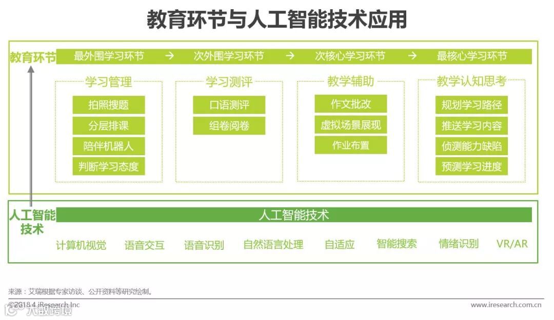 人工智能已在老师教学与学生学习、评测的各个环节切入教育领域,相关产品服务包括拍照搜题、分层排课、口语测评、组卷阅卷、作文批改、作业布置等功能,涉及了自适应、语音识别、计算机视觉、知识图谱、自然语言处理、机器翻译、机器学习等多项人工智能技术,正在创造着更加个性化、服务于终身学习的智能高效学习环境。