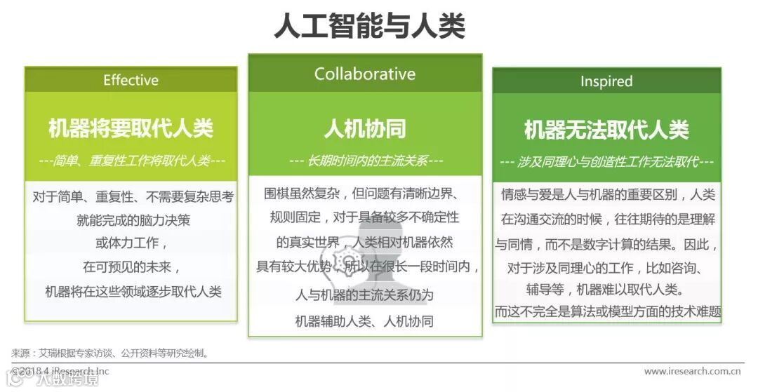 传统客服业是典型的人力密集型,被视为是人工智能最有可能全面颠覆和取代的工种。不过,从目前的实践情况来看,人工智能更多的是起到辅助人类决策和工作的层面,即,通过电话客服、网上客服、App、短信、微信以及智能机器人终端等产品与客户进行语音或文本的互动交流,理解客户浅层业务需求,回复客户提出的业务咨询,并根据客户语音导航至指定业务模块,实现优化人工客服咨询效率。智能客服目前的成熟应用主要在售后阶段,以重复性问题标准化回答为主,未来智能客服业的应用将继续升级,由现在的“以问题为中心”转变为“以用户为中心”的智能语音助理,由现在服务于企业/商家的机器人转变为服务于每一个用户。