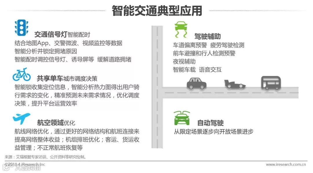 人工智能算法对交通出行所产生的信息进行了分析与预判,人工智能技术的应用衍生出一系列智能设备,并对现有设备、应用和服务提供嵌入式的智能处理能力,以协助交通管理者更好地进行决策,以便车流最有效的方式通行,提高交通流效率,实现交通升级转型——交通智能化;未来,智能化交通解决方法中,人工参与与处理将逐渐削弱,有望达到自动化运作的水平。