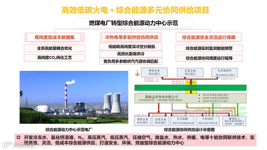 本项目聚焦孟津电厂周边工业企业综合能源需求,以开发“高效低碳火电+综合能源多元协同供给关键技术”为目标,开展二氧化碳、氮气、冷冻水、氯化钙溶液、高压蒸汽、低压蒸汽、压缩空气、除盐水、热水、供暖等多能联供研究,解决项目实施面临的能耗、成本、纯度、输送、多能流相互影响制约以及机组调峰调频受限等难题,提升火电机组能量综合利用水平与电厂长期稳定盈利能力。由于能量供应品种较多,本项目也成为集团公司首个“十联供”项目,将为集团公司以及行业内火电+综合能源的发展起到引领示范作用。