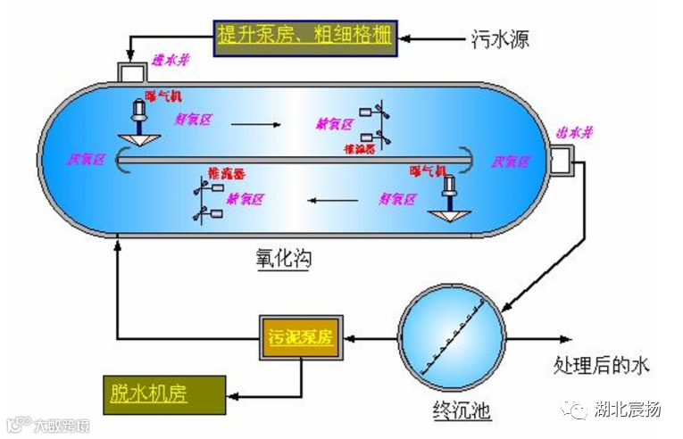 氧化沟又称“循环曝气池”,污水和活性污泥的混合液在环状曝气渠道中循环流动。氧化沟工艺采用连续流,水质水量非常稳定,脱氮效果好,抗水量水质冲击能力强,电耗一般比鼓风曝气稍高,产泥量较少。