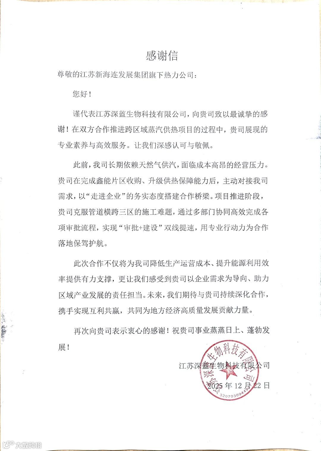 近日,热力公司收到了一封来自江苏深蓝生物科技有限公司的感谢信,信中对热力公司在推进跨区域蒸汽供热项目的过程中,展现的专业素养与高效服务给予了高度肯定。