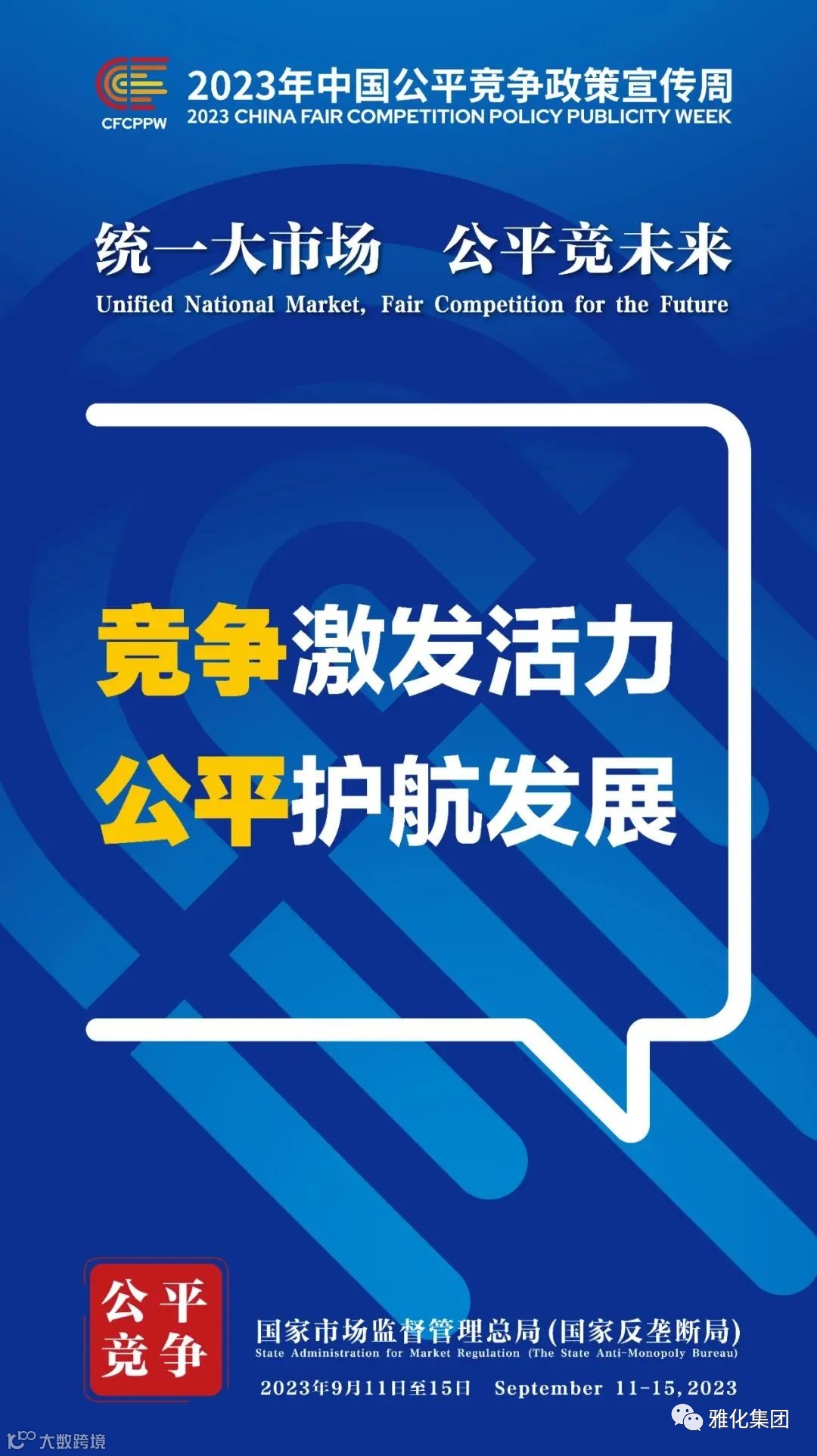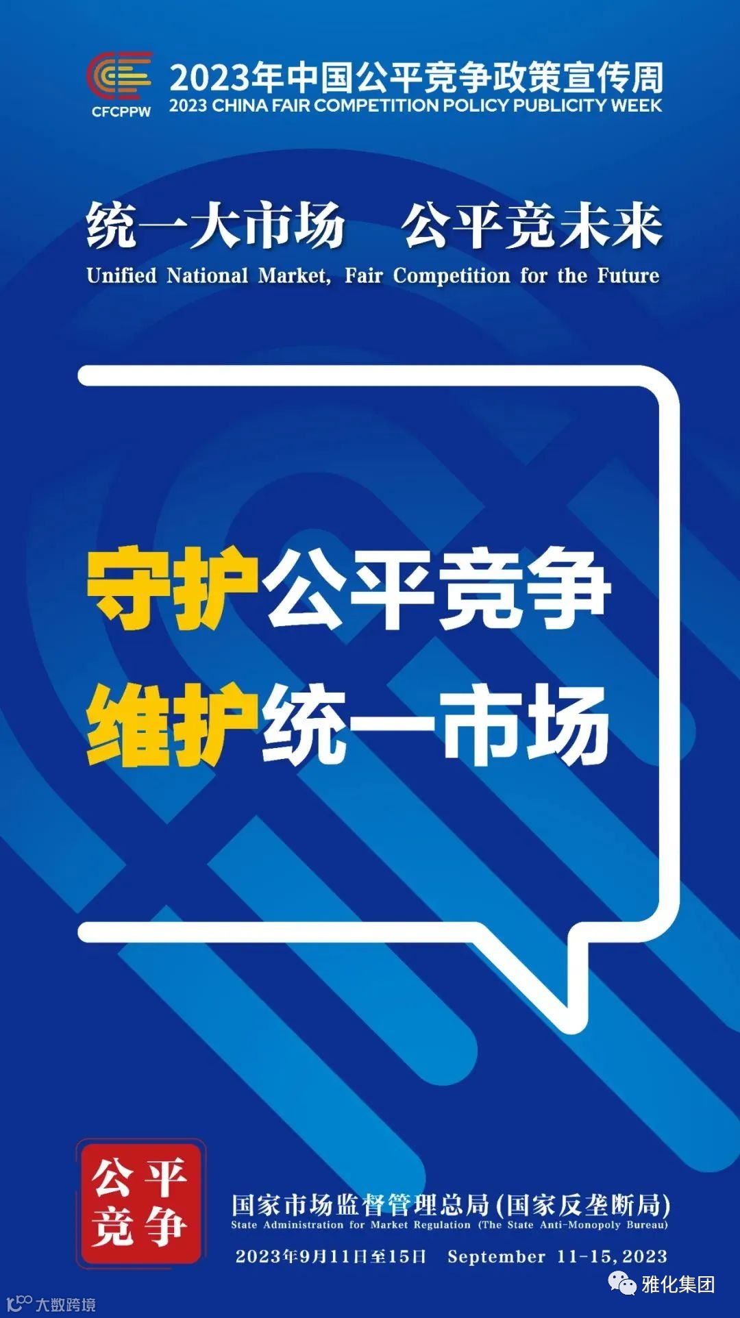 2023年中国公平竞争政策宣传周于9月11日-15日在全国范围内开展,以“统一大市场 公平竞未来”为主题。