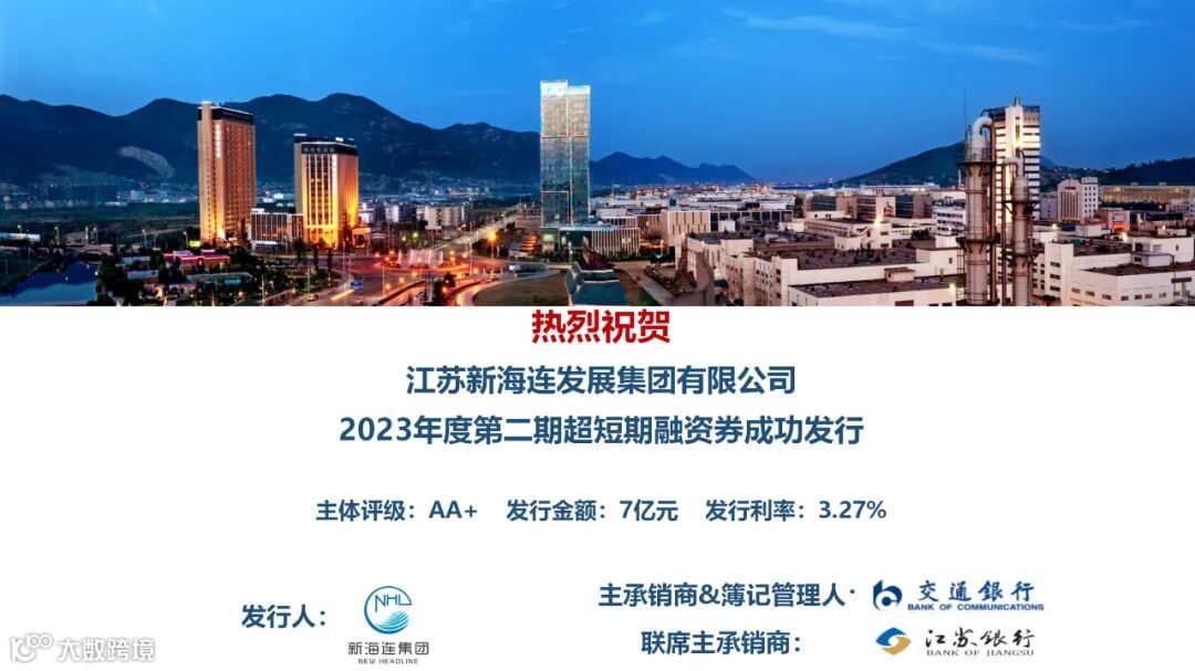 江苏新海连发展集团3月17日,新海连集团成功发行2023年第二期超短期融资券,金额7亿元,期限270天,票面利率3.27%,由交通银行、江苏银行联席主承销。