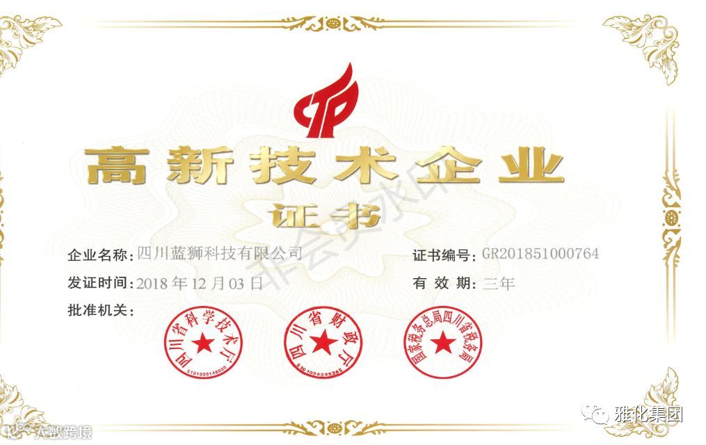 近日,雅化集团蓝狮科技经企业申报、专家评审、四川省认定机构审核,并经国家科技部备案、公示等程序,获得了由四川省科学技术厅、四川省财政厅、国家税务总局四川省税务局联合颁发的四川省“高新技术企业”证书。