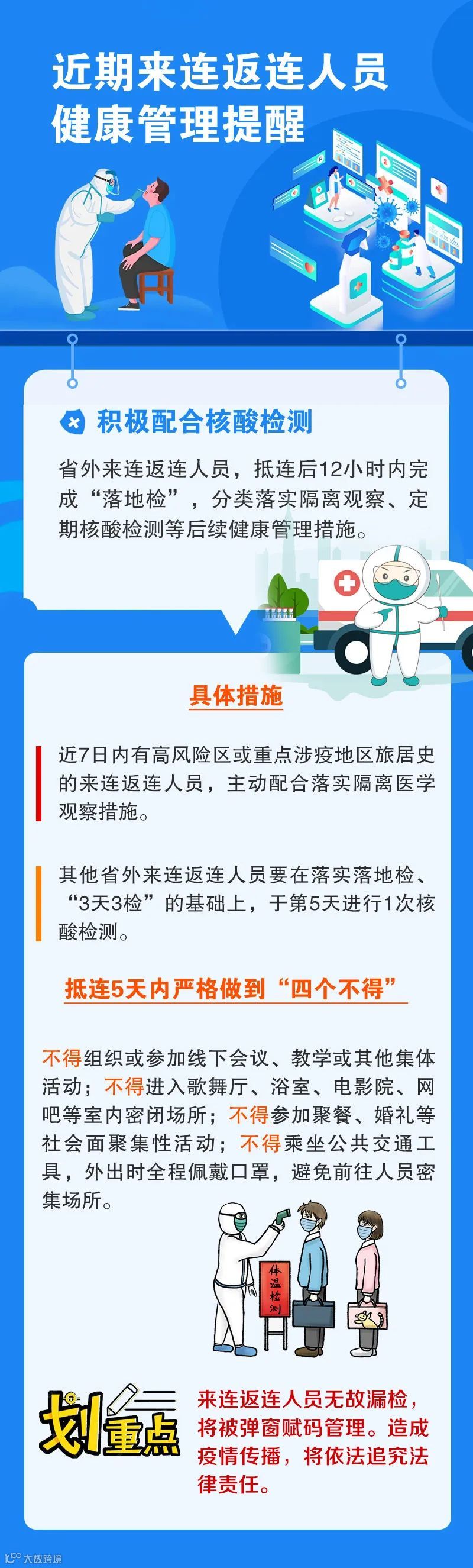 省外来连返连人员,抵连后12小时内完成“落地检”,分类落实隔离观察、定期核酸检测等后续健康管理措施。近7日内有高风险区或重点涉疫地区旅居史的来连返连人员,主动配合落实隔离医学观察措施。其他省外来连返连人员要在落实落地检、“3天3检”的基础上,于第5天进行1次核酸检测,抵连5天内严格做到“四个不得”(不得组织或参加线下会议、教学或其他集体活动;不得进入歌舞厅、浴室、电影院、网吧等室内密闭场所;不得参加聚餐、婚礼等社会面聚集性活动;不得乘坐公共交通工具,外出时全程佩戴口罩,避免前往人员密集场所)。其中由省外近5天内回到省内其他市后来连的参照省外人员执行。来连返连人员无故漏检,将被弹窗赋码管理。造成疫情传播,将依法追究法律责任。