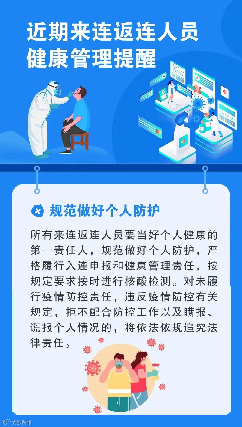 所有来连返连人员要当好个人健康的第一责任人,规范做好个人防护,严格履行入连申报和健康管理责任,按规定要求按时进行核酸检测。对未履行疫情防控责任,违反疫情防控有关规定,拒不配合防控工作以及瞒报、谎报个人情况的,将依法依规追究法律责任。