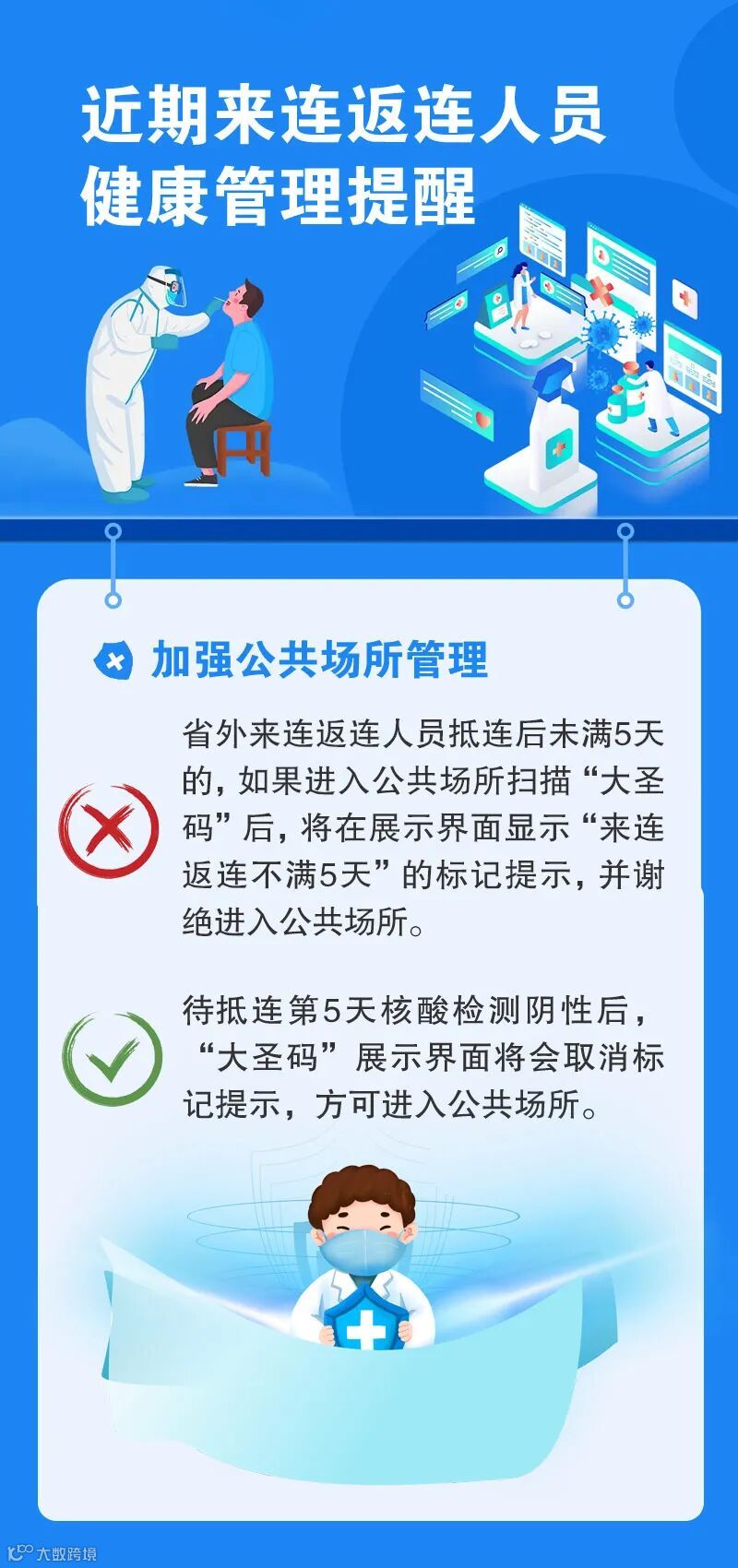 省外来连返连人员抵连后未满5天的,如果进入公共场所扫描“大圣码”后,将在展示界面显示“来连返连不满5天”的标记提示,并谢绝进入公共场所。待抵连第5天核酸检测阴性后,“大圣码”展示界面将会取消标记提示,方可进入公共场所。