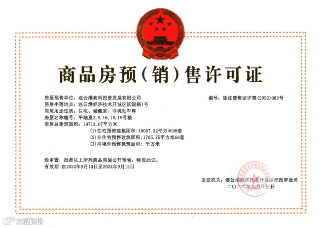 近日,高科公司平湖里项目2#、5#、16#、18#、19#楼取得《商品房预(销)售许可证》(连住建售证字第(2022)082号),共计住宅98套,总面积18007.32平方米。