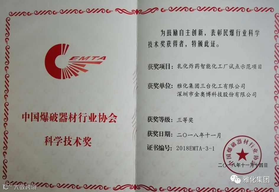 11月14日,第六届中国爆破器材行业协会科学技术奖颁奖大会在广东省佛山市隆重召开。雅化集团三台公司“乳化炸药智能化工厂试点示范项目”荣获三等奖。