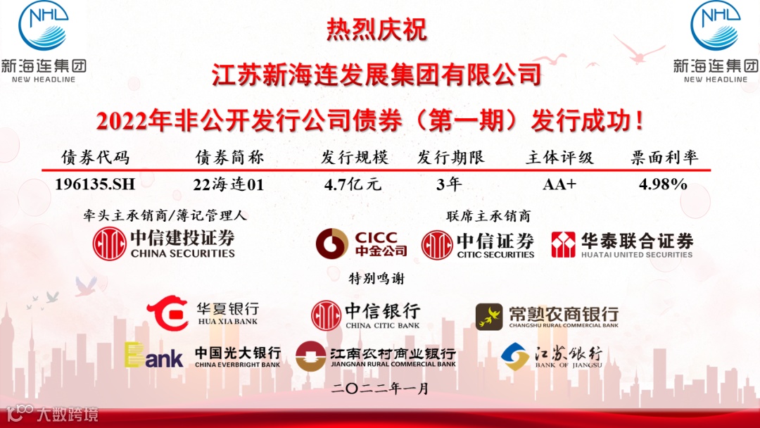 1月7日,新海连集团成功发行2022年第一期非公开发行公司债券,金额4.7亿元,期限3年,票面利率4.98%,创集团近5年来私募债券发行利率新低,由中信建投证券、中金公司、中信证券及华泰联合证券联席主承销。
