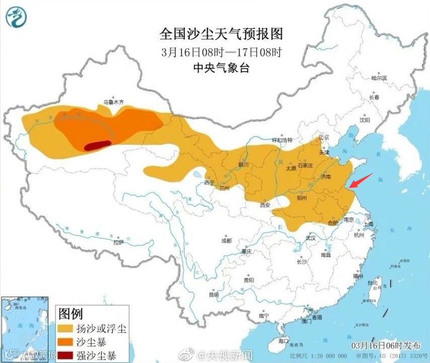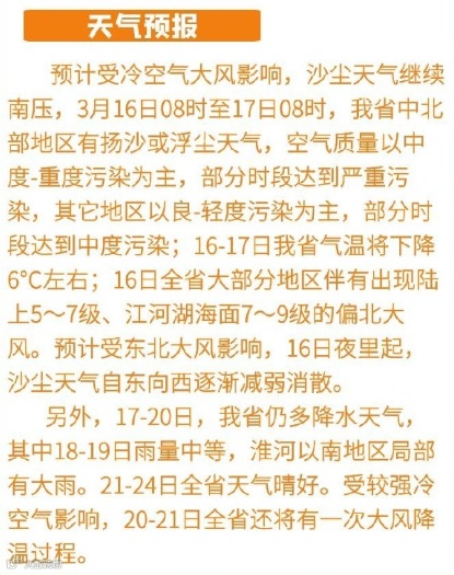 根据预报, 16日下午至晚间,沙尘对江苏影响将自东向西消散。预计17日午后,江苏全省空气质量逐渐转好,全省空气质量以良为主,沿海地区部分时段优,首要污染以PM2.5和PM10为主。