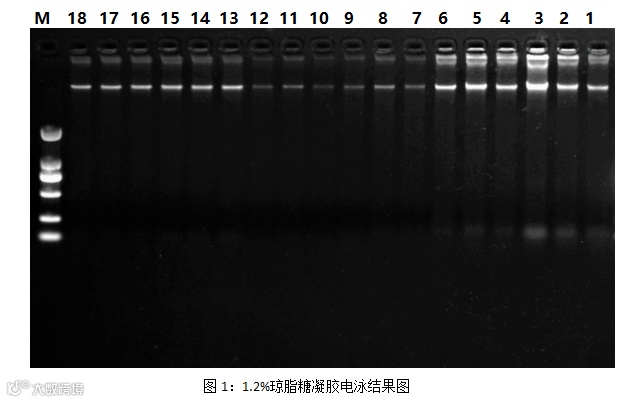 提取采用40ml晨尿,使用赛百纯生物科技有限公司尿液保存液(cat.no 1416021)进行保存,室温放置2天后,进行自动化提取。得到的核酸进行测量浓度、纯度(见表1),电泳使用10ulDNA 1.2%的琼脂糖凝胶电泳。