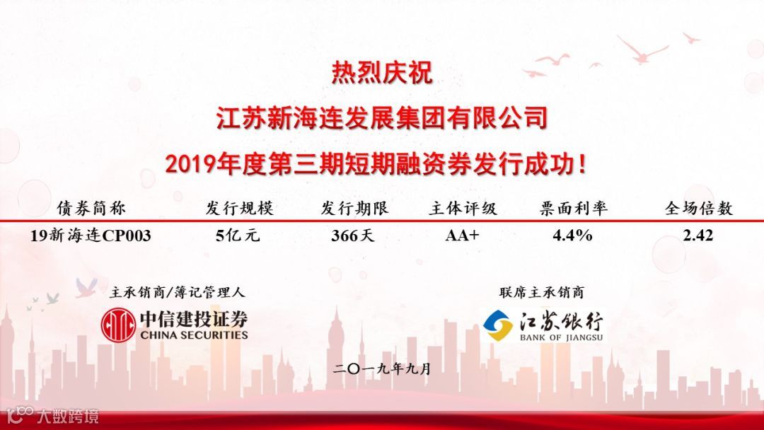 9月2日,新海连集团2019年第三期短期融资券在银行间市场成功发行。本期发行由中信建投证券担任主承销商,江苏银行担任联席承销商,募集金额5亿元,发行期限366天,全场认购倍数2.42倍,票面利率4.4%,相比去年同期票面利率下降239个BP,创集团2017年以来短融发行最低利率。