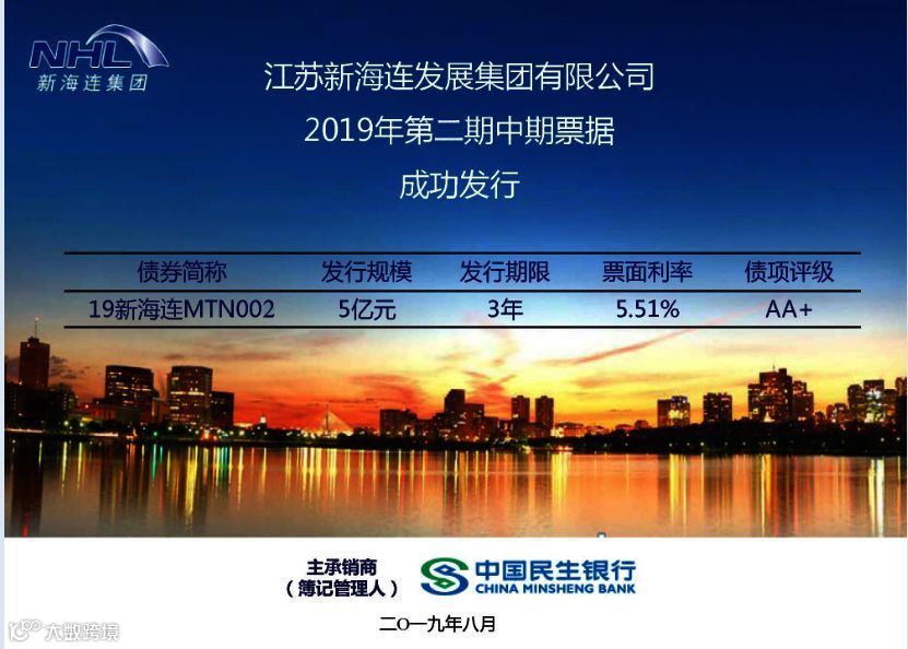 8月9日,新海连集团成功发行第二期中期票据(以下简称“MTN”),金额5亿元,期限3年,年利率5.51%,由民生银行主承销。