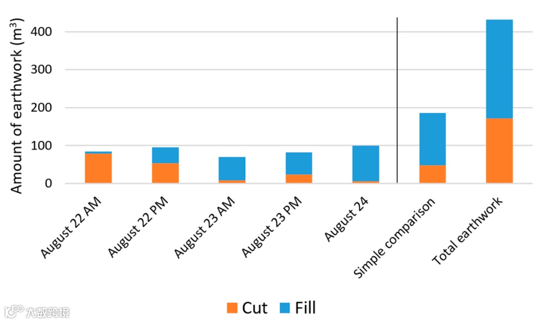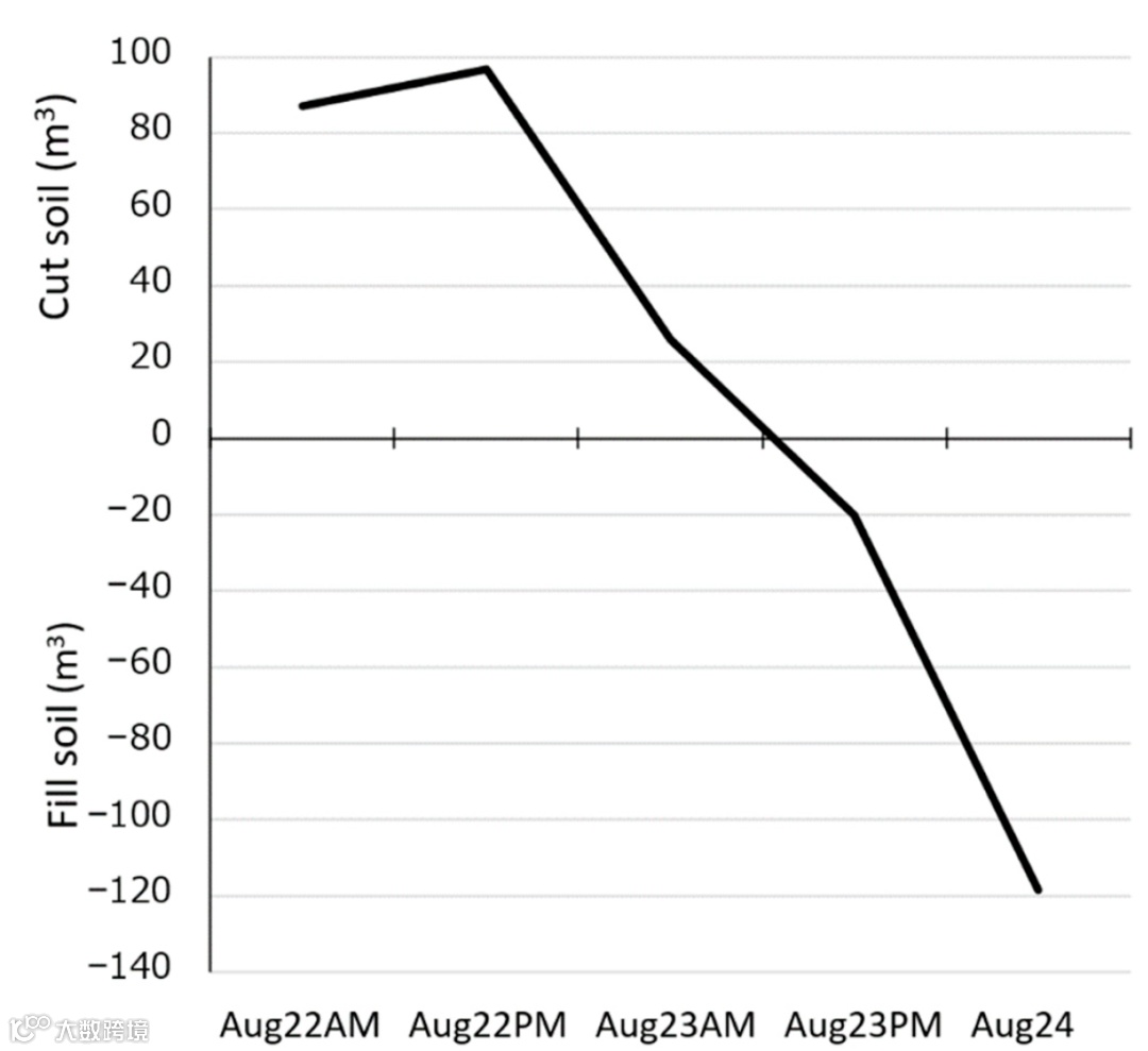 这些结果表明,SfM分析对于以立方米为单位计算土壤体积足够准确。然而,在底土植被和急坡转换点下测量的准确性还有进一步研究的余地。因此,我们计算了每个阶段的挖方和填充土方量。结果如图 6 所示。