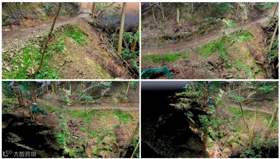 利用SfM分析成功构建了各阶段的三维模型。生成的模型的分辨率范围为3.1厘米至1.1厘米。例如,从工作完成之前、期间和之后采集的数据生成的 4D 模型,并从各个角度查看,如图1-3 所示。