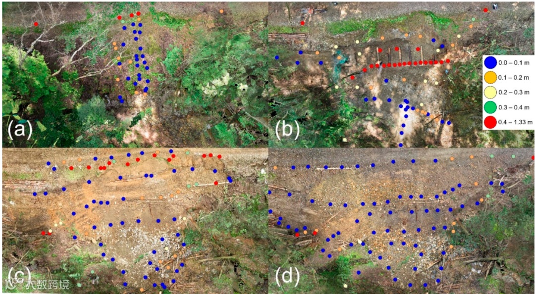 此外,在维修工作之前和期间的测量过程中,无人机摄影和TS测量之间存在相当大的时间滞后。这是因为调查是安全进行的,以便尽可能不干扰维修工作。在某些地方,土方工程或原木施工可能是在无人机飞行之后和TS调查之前进行的。考虑到这一点,我们讨论了每个阶段的测量精度。维修工作前TS测量点的误差绝对值如图5a所示。图中显示,在可见土壤的斜坡上误差较小,在植被区和路堤坡肩上观察到稍大的误差。
