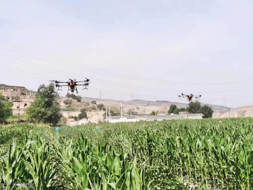 在巉口镇剡家川村,技术人员操作大型机械在地上空来回穿梭,所到之处,一道道‘药雾’从天而降,均匀喷洒,为玉米、大豆、马铃薯送来了一场及时的“营养雨”。