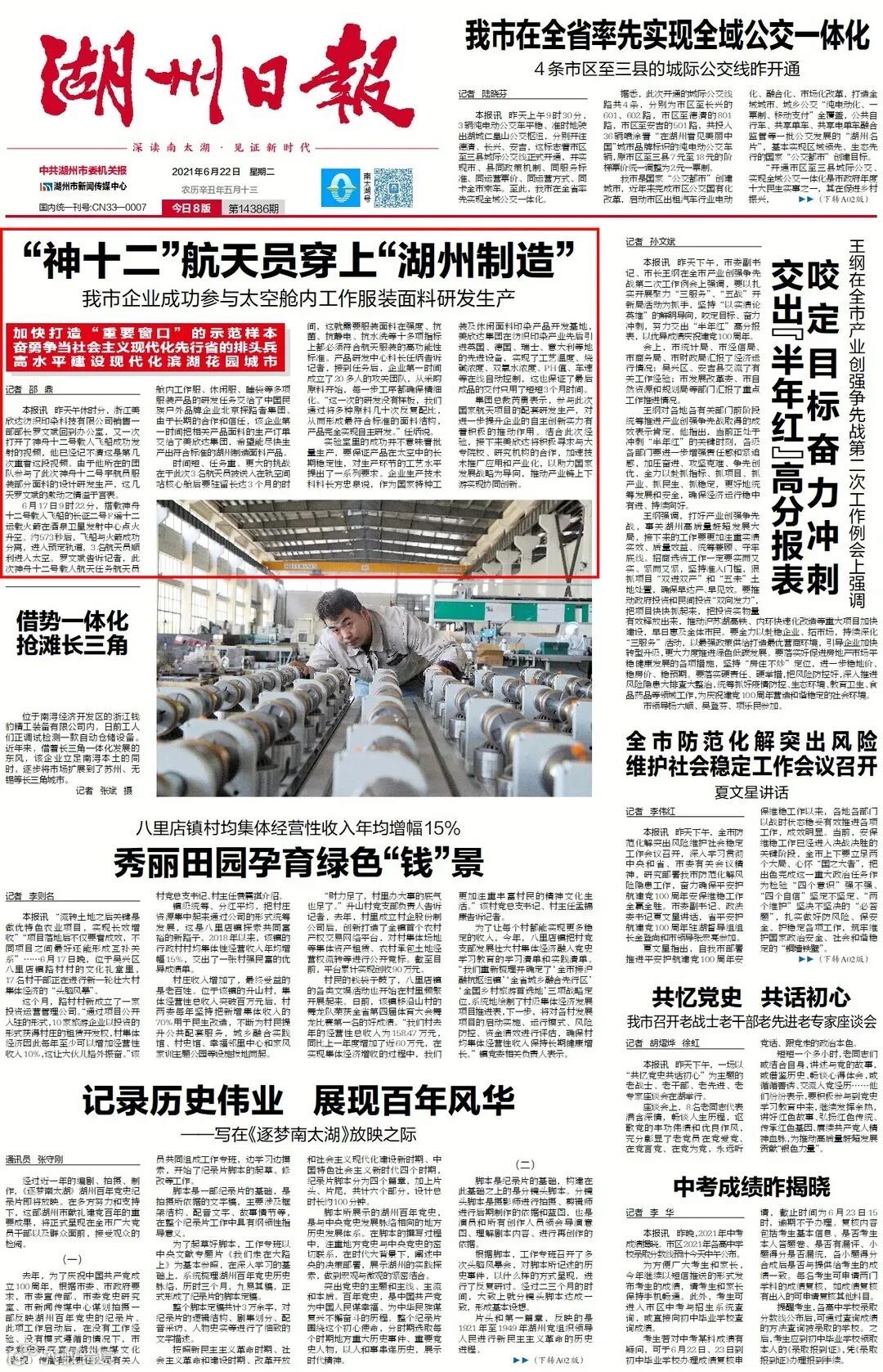 6月17日,“神舟十二号”载人飞船成功发射升空,将聂海胜、刘伯明和汤洪波三名航天员送入太空。航天员舱内工作服、休闲服、睡袋等多项服装产品,由美欣达印染科技公司研发生产。接到任务第一时间,印染科技成立了20多人的攻关团队,历时3个月,研发生产出符合航天标准的面料。9月10日,印染科技与百度签署战略合作协议,共同打造智慧低碳数字化产业园,传统产业向科技创新、数字化升级的步伐进一步加快。