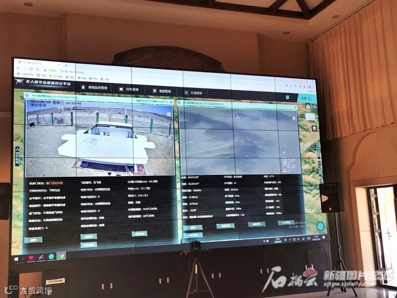 位于五彩湾的指挥中心大屏上可以看到前方无人机拍摄的巡航画面。石榴云/新疆日报记者 曹华摄