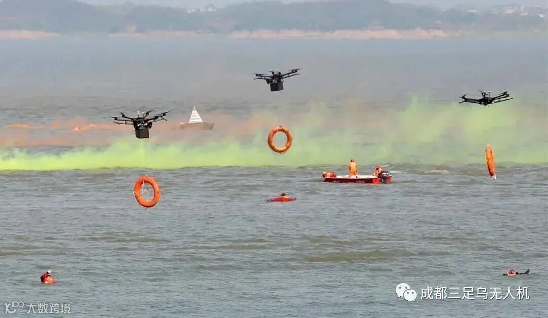 使用无人机搭载抛投器,挂载救生圈和牵引绳,将救生圈投递至被困人员,救援人员拉动牵引绳即可将被困人员救起。使用牵引救生设备,能在一定程度上避免救援人员以身犯险。