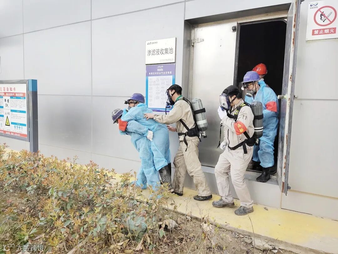 本次演练模拟劳务外包单位实施渗滤液坑道清淤作业,作业人员在清淤过程中突然倒下,有限空间外监护人员喊话无应答,经现场实地查看人员中毒。监护人员迅速汇报值长,值长立即安排值内人员佩戴正压式呼吸器迅速赶到现场,并向公司领导汇报,李友春副总迅速启动有限空间作业应急预案,救援组、安全警戒组、技术保障组、医疗救护组、物资后勤保障组立即赶赴现场开展救援工作。