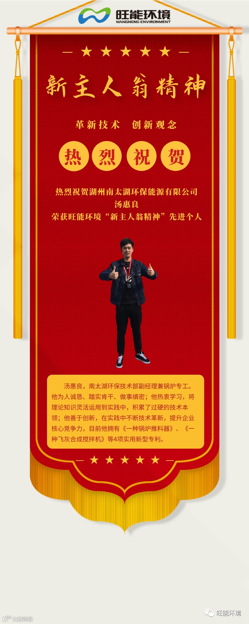 汤惠良,南太湖环保技术部副经理兼锅炉专工。他为人诚恳、踏实肯干、做事缜密;他热衷学习,将理论知识灵活运用到实践中,积累了过硬的技术本领;他善于创新,在实践中不断技术革新,目前他拥有《一种锅炉推料器》、《一种飞灰合成搅拌机》等4项实用新型专利。