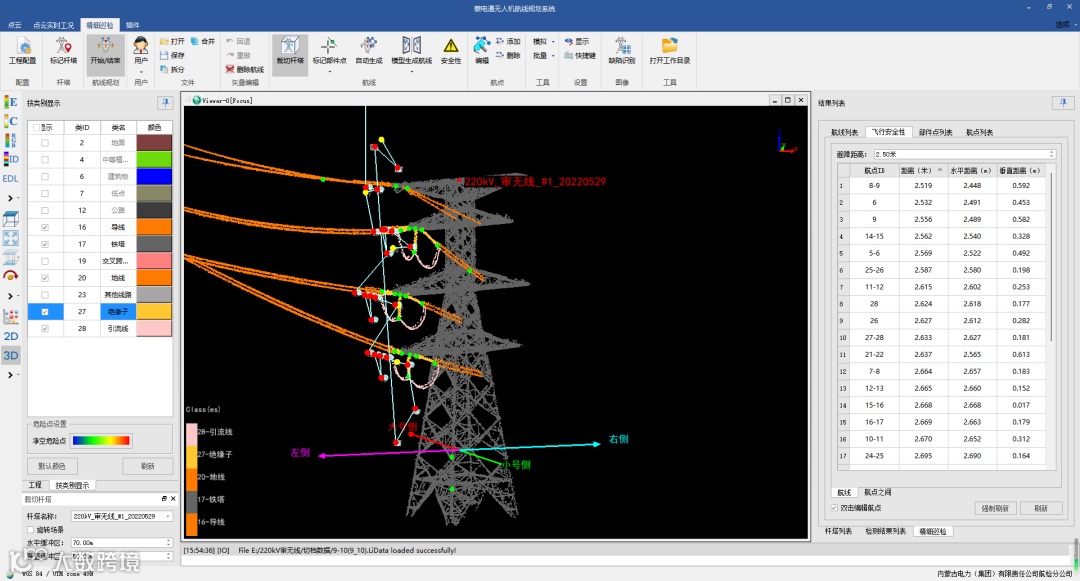 本次在220千伏审无线的巡视中,无人机通过精准的激光点云数据,实现了“航线规划——自动飞行——飞行监控”的全流程管理模式,按已设定路线开展精细化巡检作业,通过搭载的高清摄像头,完成各类金具、绝缘子、线路通道等部位的巡视拍摄任务,实现了输电线路及通道的可视化自动巡检。通过航迹导入,无人机可以在预设航线进行自主巡航拍照工作,解放了驾驶员的双手,驾驶员只需专心查看、分析无人机实时拍摄回传的巡线影像,就能完成巡视任务,巡视效率有了质的飞跃。