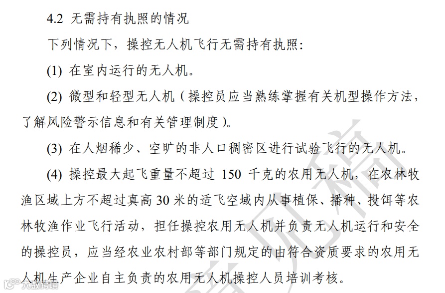相比2018年版的《民用无人机驾驶员管理规定》,无需执照管理的情况增加了“操控最大起飞重量不超过150kg的农业无人机”。
