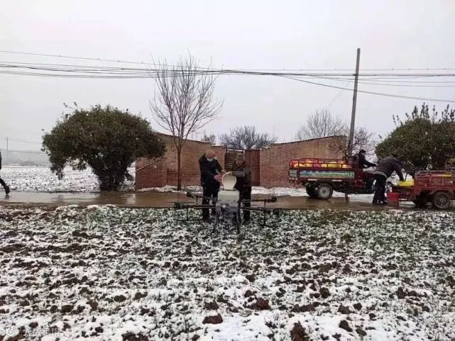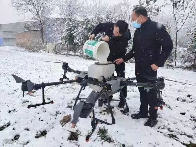 1月28日,在西安市临潼区马额街办马额村,昊天农业专业合作社抢抓雨雪天气有利时机组织植保无人机施肥。