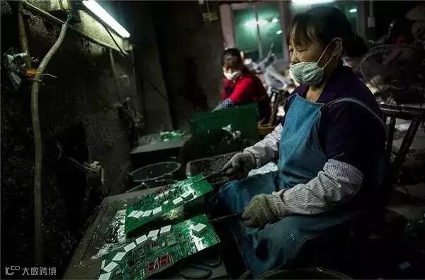 在这个世界闻名的废旧电子电器拆解基地和再生五金塑料的集散地,为了获取可以回收利用的金属和元器件,5000个小作坊用硫酸水冲洗电路板,焚烧废弃垃圾,回收处理着世界各地运来的硬盘、手机以及电脑配件。