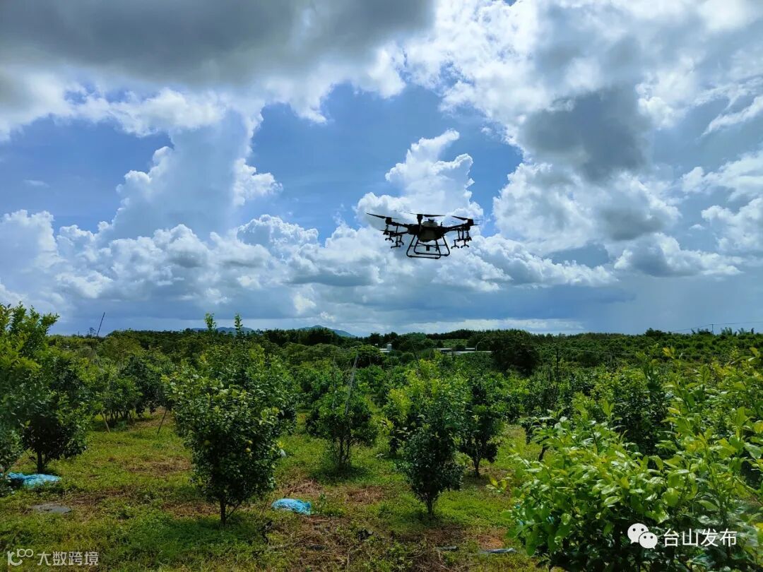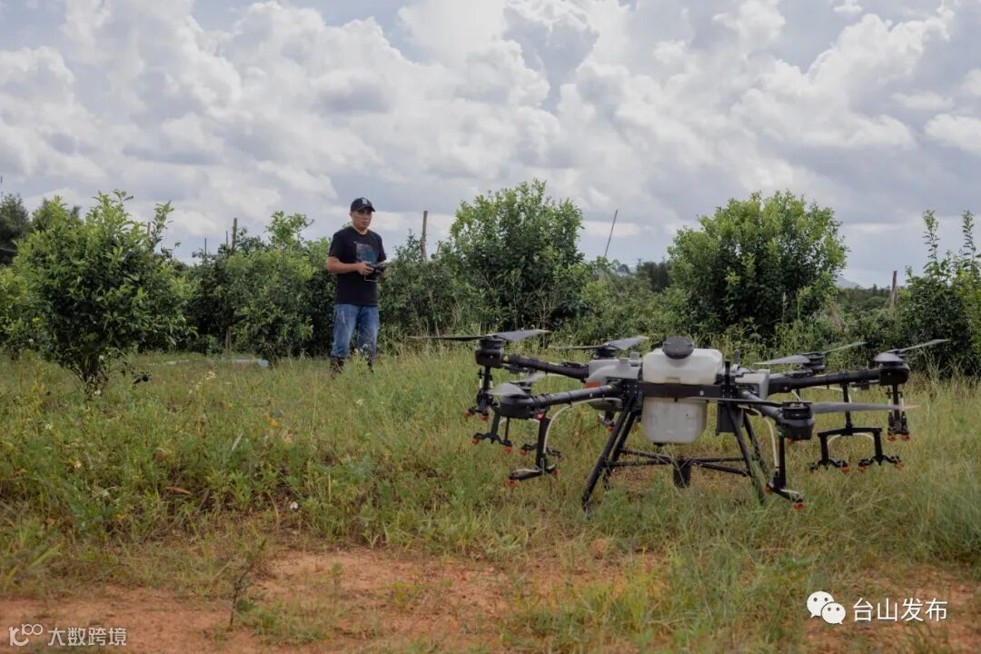 果农陈嘉坤:没买这部飞机之前,要请六七个人打药,打一个星期左右。现在使用无人机后,只需要两个人,两天时间就可以喷洒完两百亩。