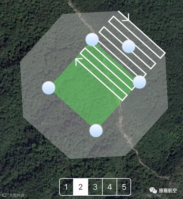 同上,在测区上方执行两条飞行航线,角度约为-60°;