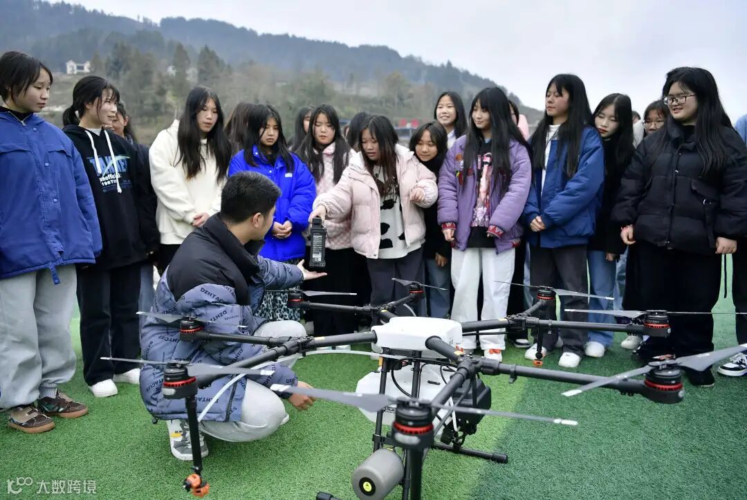 3月2日,在宣恩县中等职业技术学校,学生观摩植保无人机飞行操作(无人机照片)。