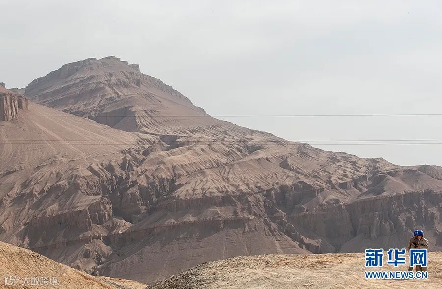 在吐鲁番火焰山,鲁莹与同事一起对110千伏高秦线杆塔和线路进行巡查排障。新华网 茹斯坦摄