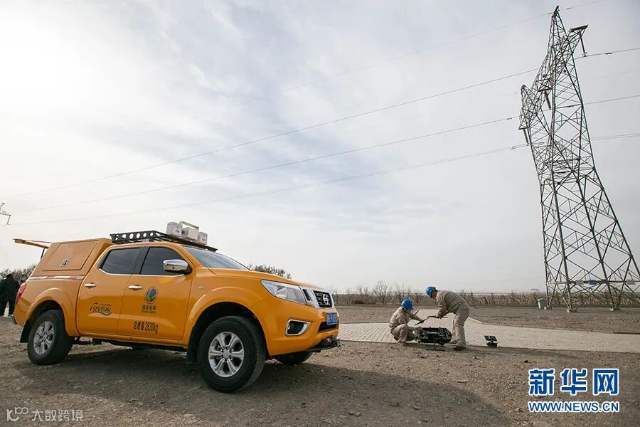 经过调试后鲁莹与他的同事来到吐鲁番火焰山,对110千伏高秦线杆塔和线路进行巡查排障。新华网 茹斯坦摄