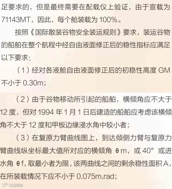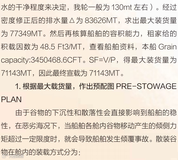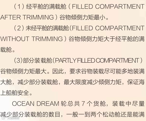装货顺序首先影响的是排水,再就是装货期间的船舶强度。装货顺序制定的原则首先是造出合适的吃水差,利于排水,尤其是对装货速度很快的港口而言更为重要。对于一般散货船,装货顺序的原则是先在船舶中部货舱开始装货,以缓解船舶中拱变形,然后首尾交替装货,以使船舶在整个装货期间不会产生过大的纵倾。另外要跟码头工头确认好码头条件,比如码头空高,装货期间能保证装货机抓斗能把货放到大舱,卸货时能保证最后的铲车能从大舱里吊出来,还有水深等限制条件。正常开始装货后就开始排水,如果港口装货速度太快,空高不受限制的话,可以提前排水,OCEAN DREAM两台泵一起排水速度大约3000MT每小时,装货速度正常一小时2000-3000MT,总体来说排水速度能够跟上装货速度。