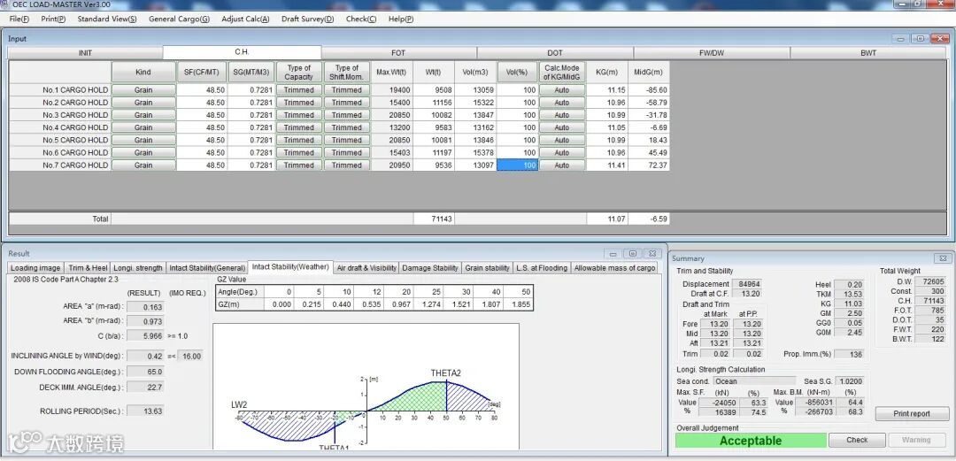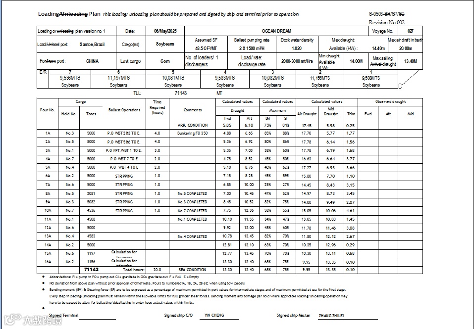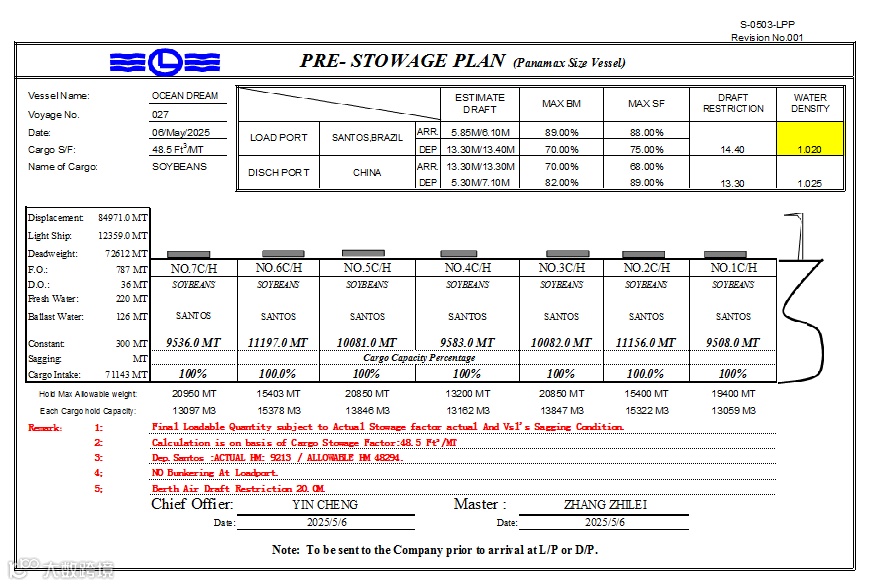 按照本轮V027航次指示,本航次巴西SANTOS拉大豆回国,货量65000MT±10%,装货港吃水限制14.4米,MAX AIR DRAFT 20米。卸货港国内,吃水限制13.3米,积载因数48.5 Ft3/MT。