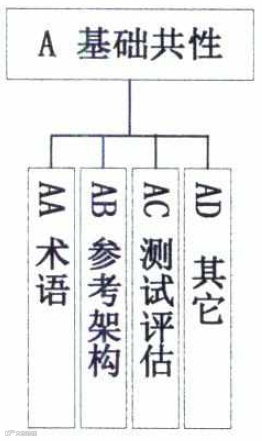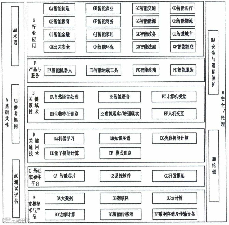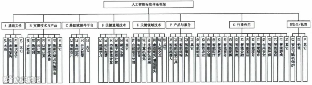 其中,A基础共性标准包括术语、参考架构、测试评估三大类,位于人工智能标准体系结构的最左侧,支撑标准体系结构中其它部分;