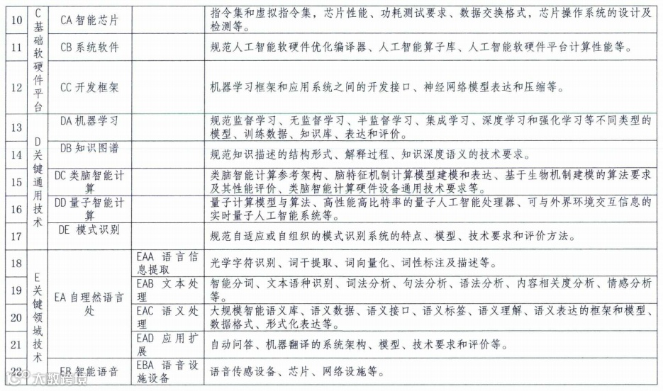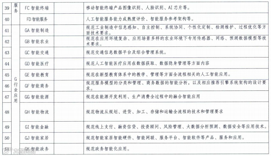 4.智能服务标准。包括图像识别、智能语音、自然语言处理、机器学习算法等标准。重点开展人工智能服务能力成熟度评价、智能服务参考架构等标准制定工作。